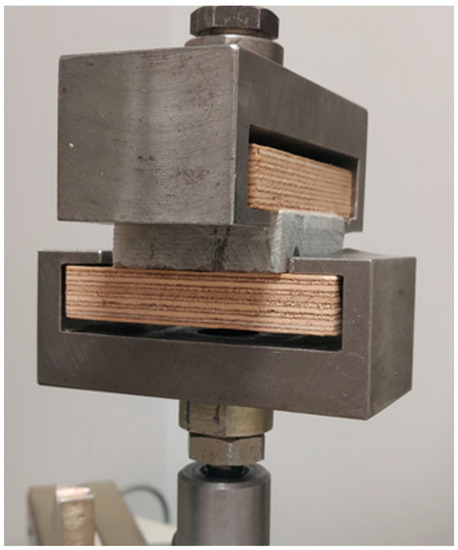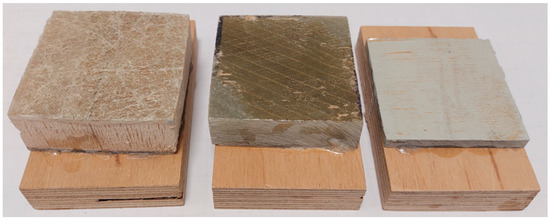 As a preliminary test, the strength of the adhesive joint was assessed to check whether the urea-formaldehyde resin allows for the sufficient bonding of polymer chips with wood chips. The assessment was made relatively simple, i.e., by determining the tensile strength perpendicular to the planes (Figure 3). At the same time, it was assumed that the joint would probably be damaged rather than being pieces of polymer or a piece of plywood. Pieces of blades with dimensions of 50 × 50 mm (the thickness as intended for grinding) were prepared for the tests. Three different variants were received from Anmet (Figure 4). The samples differ in both the thickness and quality of the material from which they were made.