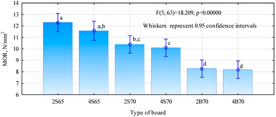 Static bending strength of manufactured wood–polymer boards. Homogeneous groups are marked with lowercase letters.
