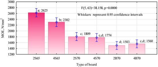 Figure 7 presents the results of the analysis of variance (ANOVA) of the outcomes of static bending strength of the manufactured wood–polymer boards. This is a very simplified approach because not only did the boards differ in density and the degree of gluing, but also in the quantity and dimensional quality of the polymer particles.