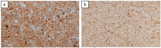 The relatively high density in the inner part of the board, being close to 600 kg/m3, is probably why the analyzed boards achieved such high tensile strength values perpendicular to the planes. In the case of furniture particleboards, the density in the center of the board may be lower than 500 kg/m3 and may oscillate around 460–480 kg/m3. Although the ANOVA did not show significant differences between individual boards regarding the tensile strength perpendicular to the planes, one more analysis was performed for the S65 boards (Figure 9). Only these two variants of the boards were compared with each other using Student’s t-test. The analysis showed that the strength of these two types of boards differed statically (p = 0.013356). Therefore, the lower modulus of elasticity in the case of these boards may be caused by the quality of the gluing of individual chips. Figure 10 shows differences in the appearance of the board surface resulting from the amount of introduced polymer particles and their quality. The finer polymer chips blend better into the structure of the manufactured polymer–particle boards.