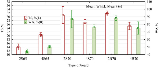 - Thickness swelling (TS) after 24 h, according to EN 317 [28], and water absorption (WA).