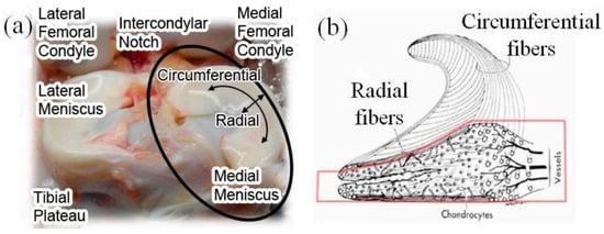 (a) Anatomical photograph of human meniscus; (b) internal microstructure at cross-section [26,27].