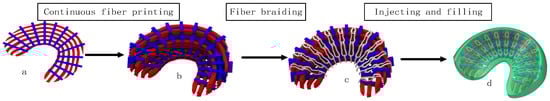 The integrated molding fabric produced by traditional 3D braiding technology has a single internal fiber distribution, which is difficult to satisfy the personalized distribution requirements of meniscus’s internal fibers. Therefore, the 3D braiding meniscus’s structure is manufactured by combining continuous fiber 3D printing technology and 3D braiding technology. A detailed explanation of the braiding process steps is shown in Figure 3. First, based on the continuous fiber 3D printing technology, a truss structure as shown in Figure 3b is gradually printed and stacked according to the layered design structure of the meniscus, which provides support for subsequent fiber braiding. Second, adapting the technology of the hook and pick mechanism in the traditional braiding process to form a collar, the fiber is woven into the truss structure to form an interlocking braiding structure, as shown in Figure 3c. Third, the woven meniscus structure is injected and filled with suitable substrate in the corresponding mold to accomplish the preparation of integral 3D braiding meniscus prosthesis, as shown in Figure 3d.