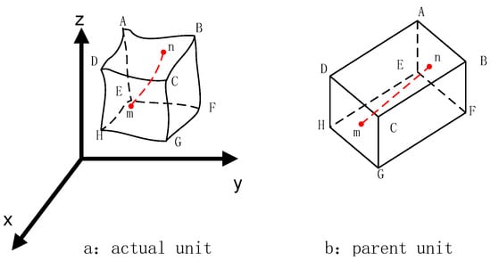 The 3D woven composite materials are continuous on a macro-scale, while they can be considered as spatial structures of constituent materials at the micro-level. Therefore, in the process of finite element analysis of 3D woven composite materials, the micro-unit cell model is adopted as a discrete element to perform macro-grid division of the three-dimensional braided composite material, and numerical analysis is carried out on the micro-unit cell model. For the convenience of calculation, the micro-unit cell model is defined as a rectangular element, which includes a rectangular matrix element of isotropic elastic material and a fiber element with uniaxial stiffness [42,43,44]. Firstly, the matrix element is defined as eight-node hexahedral, while the fiber element is treated as two-bar element. Secondly, due to the same shape matrix being applicable to the matrix element and fiber element, the each node’s displacement of the fiber element is determined by the node’s displacement of the matrix element. As shown in Figure 5, the degrees of freedom at node and are subjected by nodes . Lastly, based on the transformation relationship between the local and global coordinate systems of the matrix and fiber, the stiffness matrix under the global coordinate system of the matrix and fiber is derived and superimposed [45].