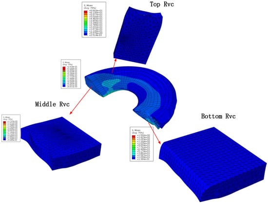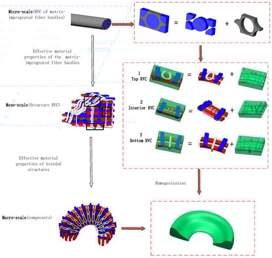 Generally, three-dimensional braided composite materials can be analyzed through three scales: micro-scale, meso-scale, and macro-scale, which are corresponding to the fiber bundles, the representative volume element of woven structure, and the integral fabric [46]. Firstly, the micro-scale RVE model is calculated to obtain the mechanical properties of fiber bundles based on the elastic properties of the fiber, matrix, and interface. Secondly, assign the results of the previous calculation to the material properties of the fiber bundle, and the mechanical properties of the matrix and interface remain coherently [47]. Similarly, the mechanical properties of three meso-scale RVE models can be obtained. Lastly, the homogenized results from the three meso-scale RVE models are substituted into the macro-scale to generate the overall mechanical performance. The entire analysis relies on Abaqus/standard. Figure 6 presents the procedure of finite element analysis of the 3D braided meniscus’s multi-scale model [48]. The fundamental step is to acquire the mechanical properties of matrix-impregnated fiber bundles composed of matrix and fiber. To facilitate for applying periodic boundary conditions, the hexagonal RVCs are used [49,50,51]. The predictive mechanical properties of fiber bundles and three RVCs based on multi-scale finite element method are listed in Table 3.