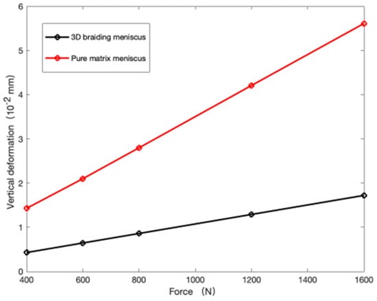 Figure 7 shows the stress–vertical deformation curve of the 3D braiding meniscus and the pure matrix meniscus. It can be concluded the three-dimensional braided structure has an improved resistance to deformation by about 60% compared to the pure matrix support in the vertical direction, which indicates that the designed structure can significantly improve the previous characteristics of meniscus delamination and fracture.
