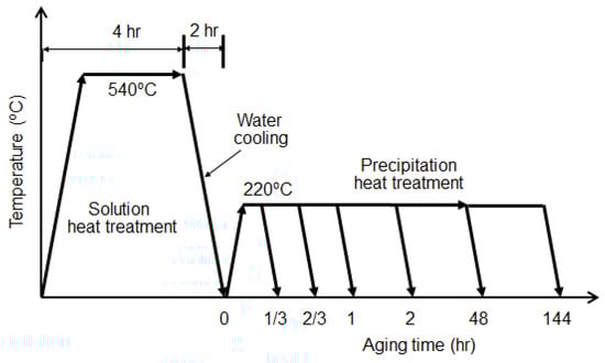 In order to conduct the heat treatment, aluminum alloy 6061 specimens with a thickness of 1 cm were prepared. Then, the specimens were subjected to a thermal cycle consisting of solution heat treatment and precipitation heat treatment, as shown in Figure 1. As shown in Figure 1, all the specimens were solution-heat-treated first at 540 °C for 4 h and then cooled in water for 2 h. After water cooling, artificial aging treatment was performed at different times at a temperature of 220 °C. A total of 7 specimens were prepared: one right after water quenching (0 h) and six after artificial aging with different times (1/3, 2/3, 1, 2, 48, and 144 h).