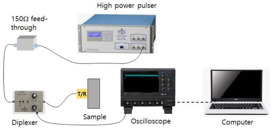 Figure 2 shows the experimental setup for SHG measurement in the pulse-echo mode. A high power toneburst pulser (RPR-4000, RITEC, Warwick, RI, USA) is used to produce a high voltage 5 cycle toneburst tuned to the fundamental frequency (5 MHz) that is applied to the transmitter via a 150 Ohm high power feedthrough and a broadband diplexer (RDX-6, RITEC, Warwick, RI, USA), a passive device for allowing a single transducer to be used both for transmitting and receiving sound in pulse-echo testing. The receiver signal is captured on a digital storage oscilloscope (WaveSurfer 3024, Teledyne LeCroy, Chestnut Ridge, NY, USA). Seven different input voltages (from 0 to 60 power levels in 10 level step) are applied from the high power pulser. These input power levels correspond to about 30–440 at the transmitter.