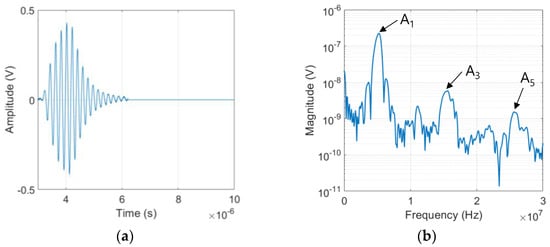 Received output signal: (a) typical time domain waveform; and (b) magnitude spectrum.