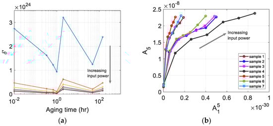 The relative quintic nonlinearity parameter of each sample at a specific input power level was calculated using , where and are the spectral peak values at the fundamental and fifth harmonic frequencies, respectively. Figure 5a shows of seven samples measured at seven different input power levels. The calculation of these parameters is based on the relationship between and measured at seven different input power levels shown in Figure 5b. The results of in Figure 5a are before the source nonlinearity correction was made. A detailed procedure of source nonlinearity correction will be described later, and the relationship between the source nonlinearity corrected and the aging time will also be discussed.