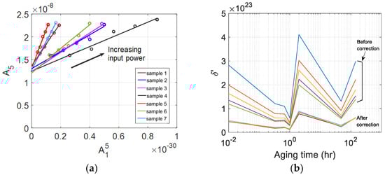 Comparing the results of before and after source nonlinearity correction (Figure 5a and Figure 6b), the before correction is widely scattered over the five input power levels used for linear curve fitting, whereas the after correction is very narrowly clustered. The dependence of the corrected of each sample on the input power is now greatly reduced, and this decrease in input voltage dependence is more evident at relatively low input voltages. In addition, the magnitude of decreased and the characteristic behavior as a function of the aging time was maintained after corrections for the source nonlinearity, so the correction appears to have been made adequately in the right direction.