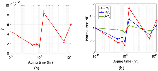 Figure 6b shows the variation of corrected as a function of aging time. Right after solution heat treatment and water quenching at 220 °C, shows a continuous decrease until 20 min. of aging time and then a slight increase at 40 min. and a decrease again to reach a minimum at about one hours. After reaching the minimum value, it increases rapidly at about 2 h, then rapidly decreases at 48 h, and gradually increases at 144 h. This behavior of agrees very well with that of the absolute measurement results [30], but their sensitivity is different as compared below. The variation of as a function of the aging time can be explained by the microstructural change of the material due to the generation, evolution, and extinction of the precipitates inside the specimen caused by the precipitation heat treatment and aging time [31,32].