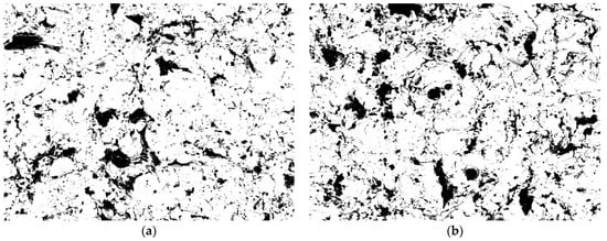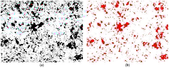 Dark areas appeared on the surface of metal alloy samples after abrasive blasting, indicating a difference in the chemical composition compared to the treated substrate. Quantitative metallography methods with the application of the Metillo program were used to determine the surface fraction of abrasive particles [22,27]. Briefly, the microscope image was loaded into Metillo and subjected to the following procedures: shadow correction, normalisation of the grey-level histogram, and manual binarization. The percentage share of the dark (red) areas of the total abrasive elements embedded in the surface of the sample was then calculated. Figure 2a shows an exemplary microscopic photo presenting the manual binarization of the image of a ZrO2 sample after abrasive blasting with Al2O3 grain size 110 μm and pressure 0.2 MPa. The red areas in Figure 2b are aluminum particles embedded in the surface of the sample.
