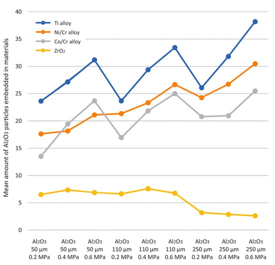 The amount of embedded abrasive particles was found to depend on the type of material, the abrasive gradation, and the amount of applied pressure. The tested materials were characterized by different hardness, from very soft titanium (97 HV) through a slightly harder Ni/Cr alloy (195 HV), harder Cr/Co alloy (300 HV), to very hard ZrO2 (1300 HV). It should be emphasized that the hardness of ZrO2 was close to the hardness of the used abrasive materials. The largest amount of driven abrasive, regardless of the type of abrasive material and processing parameters, was observed on the surfaces of samples made of titanium alloy, followed by Ni/Cr and Co/Cr alloys, and the smallest amount was noted for the surfaces of ZrO2 samples. Here we can see a clear and most important dependence of the number of driven grains on the hardness of the workpiece—the higher its hardness, the fewer stuck grains with the same machining parameters. The surface occupied by embedded particles can increase many times over. Depending on the parameters used, it ranges from 2.62 to 7.58% for ZrO2, through 13.51 to 25.50% for the Cr/Co alloy, 17.63 to 30.48% for the Ni/Cr alloy, up to 23.64 to 38.19% for the Ti alloy. This relationship can be explained by the relationship between the grain energy and the energy needed to perform cutting work. We can observe a complete loss of energy by a particle that is stopped at the moment of contact with the treated surface or a partial loss of energy during which the particle bounces off the treated surface. As ZrO2 is harder than aluminum oxide, fewer particles become embedded. As such, the differences are not as visible. However, it is not obvious how many grains will be driven in, and this has a direct impact on the bond between the framework and the veneering ceramics.