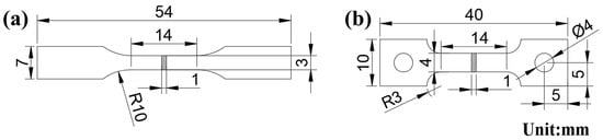 Geometric dimension of the specimens for (a) room-temperature tensile test; and (b) high-temperature tensile test.