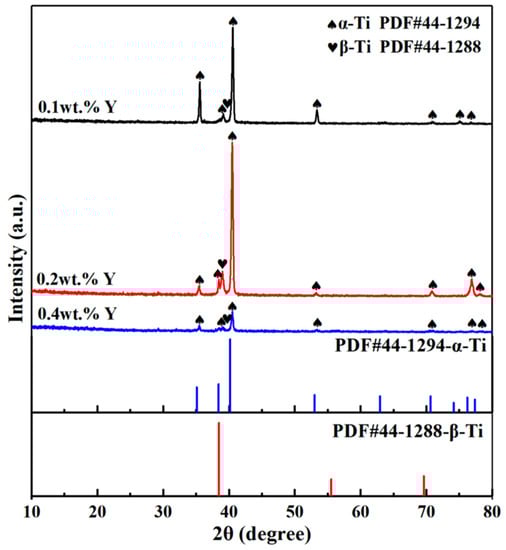Figure 2 shows the XRD spectra of the as-cast Ti-5Al-2.75Sn-3Zr-1.5Mo-0.45Si-1W-2Nb-xY (x = 0.1, 0.2, 0.4) alloys. It can be seen that the as-cast alloys are mainly composed of close-packed hexagonal (hcp) α-Ti phase and a small amount of body-centered cubic (bcc) β-Ti phase, and all the alloys still belong to near-α titanium alloy. It also can be observed that the increase of Y content promotes the diffraction peak of the α-Ti phase to move to a low angle direction. According to the Bragg’s equation [], the shift of the diffraction peak to a low angle is caused by lattice expansion. The lattice parameters of the α-Ti phase in 0.1 wt.%, 0.2 wt.% and 0.4 wt.% Y composition alloys were obtained by XRD refinement, and the averages of three measurement results are a = 0.2914 nm, c = 0.4643 nm; a = 0.2923 nm, c = 0.4678 nm; and a = 0.2920 nm, c = 0.4687 nm, respectively. It can be seen that both the lattice parameter “a” and “c” increase due to the Y with large atomic radius substituting for Ti atoms with small atomic radius, with the increase of Y content.