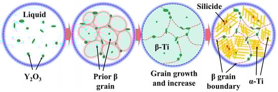 The solid solubility of the Y element in titanium alloy is low, and it has strong chemical activity and deoxidation, which can capture the interstitial oxygen in the Ti matrix to form the Y2O3 phase []. Figure 6 sketches the possible solidification path of the high-temperature titanium alloys containing Y. It can be seen that the Y2O3 phase can be directly formed in the liquid phase due to its higher melting point than the titanium alloy. As the solidification temperature decreases, the β phase forms, and some Y2O3 phases can serve as a heterogeneous nucleation site for the β phase, improving its nucleation rate. In this case, the Y2O3 phase in the remaining liquid phase will be pushed into the interdendritic region of the β phase. Therefore, most Y2O3 phases would eventually be distributed at the prior β grain boundaries. As the temperature continues to decrease, the silicide phase will precipitate from the β phase; then, β/α transformation occurs. Thus, the Y2O3 phase can cooperate with the silicide phase to produce a pinning effect on grain boundaries and improve the mechanical properties of the alloy at high temperatures.