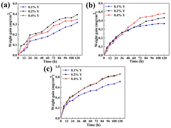 Figure 7 illustrates the oxidation weight gain curves of as-cast alloys with different Y content, oxidized at different temperatures for up to 120 h. It can be seen that the oxidation weight gain of alloys with different Y content increases with the increase of oxidation time. The oxidation weight gain of alloys increases with the increase of oxidation temperature at the same Y content. Further increase in Y content under the same conditions has adverse effects on the oxidation resistance of the alloy. The oxidation weight gain per unit area of as-cast alloys with different Y content at different temperatures for 120 h is shown in Table 3. Combined with the analysis in Figure 7, the 0.1 wt.% Y composition alloy has the smallest weight gain value and the best high-temperature oxidation resistance.