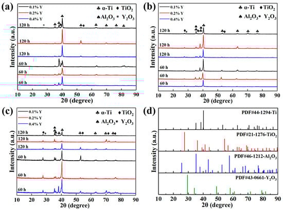 XRD patterns of the as-cast alloys with different Y content after being oxidized at different temperatures for 60 h and 120 h: (a) 650 °C; (b) 700 °C; (c) 750 °C; (d) standard spectrum.
