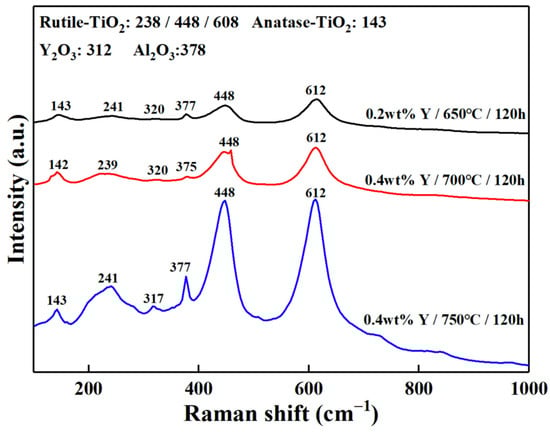 To further analyze the compositions of the surface oxidation products, LRS and XPS tests were conducted. The 0.2 wt.% Y composition alloy oxidized at 650 °C for 120 h and 0.4 wt.% Y composition alloy oxidized at 700 °C and 750 °C for 120 h were selected for the laser Raman test in the range of 100~1000 cm−1. The corresponding laser Raman spectra are displayed in Figure 9. It can be seen that the oxidation products are composed of rutile-TiO2 (238 cm−1, 448 cm−1, 608 cm−1), anatase-TiO2 (143 cm−1), Y2O3 (312 cm−1) and Al2O3 (378 cm−1) []. However, anatase-TiO2 was not found in the XRD analysis (Figure 8) due to its low content and easy encapsulation by rutile-TiO2.