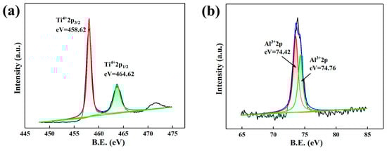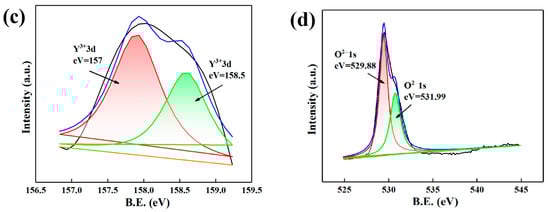 Figure 10 illustrates the XPS spectra of 0.4 wt.% Y composition alloy oxidized at 750 °C for 120 h. It can be seen that the valence states of elements in the oxidation products are Ti4+ (458.62 eV, 464.62 eV), Al3+ (74.76 eV, 74.42 eV), O2− (529.88 eV, 531.99 eV) and Y3+ (158.5 eV, 156.47 eV, 157.0 eV) []. Among them, O2− with a binding energy of 529.88 eV and 531.99 eV is oxygen in titanium oxide and alumina, respectively. Ti4 + with a binding energy of 458.62 eV and 464.62 eV is titanium in anatase-TiO2 and rutile-TiO2, respectively. The fitting results of XPS are consistent with the results of laser Raman and XRD analysis. Therefore, it can be considered that the oxidation products of the alloy are composed of rutile-TiO2, anatase-TiO2, Y2O3 and Al2O3.