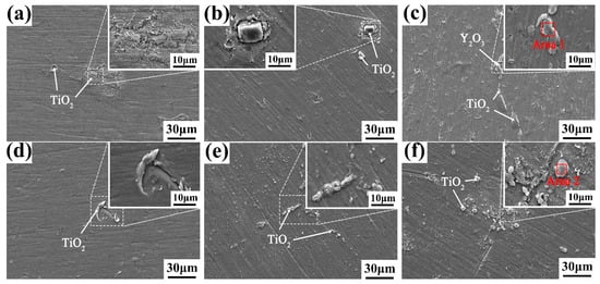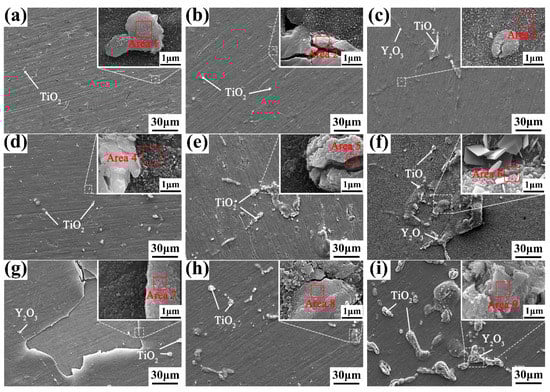 Figure 11 shows the surface morphology of as-cast alloys with different Y content after oxidation for 120 h at different temperatures. EDS analysis results of the oxidation surface marked in Figure 11 are listed in Table 6. It can be seen that the oxidation surfaces are mainly composed of granular TiO2, short rod Y2O3 and Al2O3. The oxide particles on the surface of the alloys oxidized at 650 °C are smaller, and no serious cracks are observed on the oxidized surfaces. As the oxidation temperature exceeds 700 °C, the amount and size of the oxide particles increases significantly. Therefore, stress would occur between the oxide particles and the matrix, causing cracks. These cracks provide a large number of channels for the internal diffusion of oxygen atoms, which is not conducive to the formation of a uniform and dense oxide film. When the oxidation temperature exceeds 750 °C, the integrity of the oxide layer is seriously damaged. Thus, the oxidation resistance of the alloy decreases with the increase of oxidation temperatures. The number and size of oxidation products increase with the increase of Y content, further indicating that the 0.1 wt.% Y composition alloy has the best high-temperature oxidation resistance.