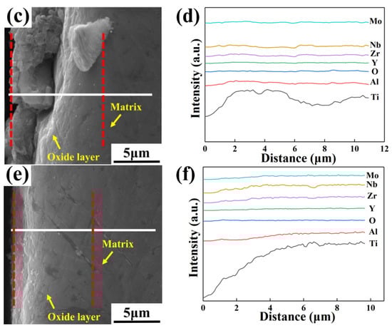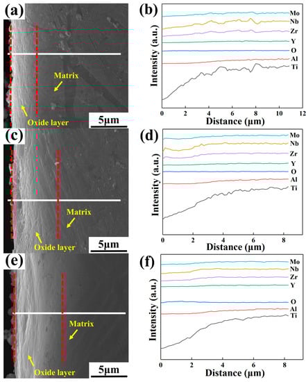Cross-section morphologies and elemental distribution curves of the oxidation surfaces of as-cast alloys with different Y content after oxidation for 120 h at 750 °C: (a,b) 0.1 wt.% Y; (c,d) 0.2 wt.% Y; (e,f) 0.4 wt.% Y.