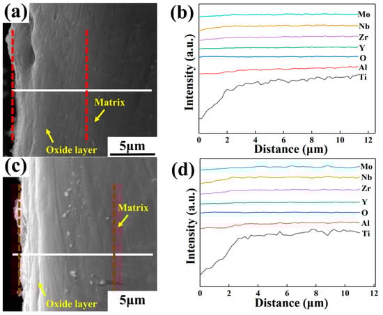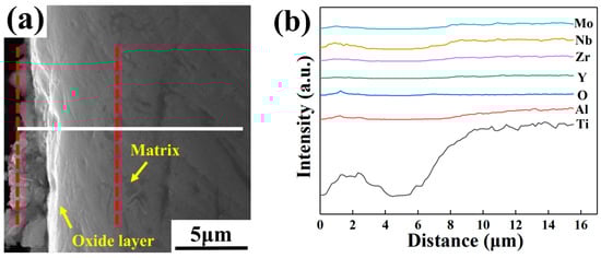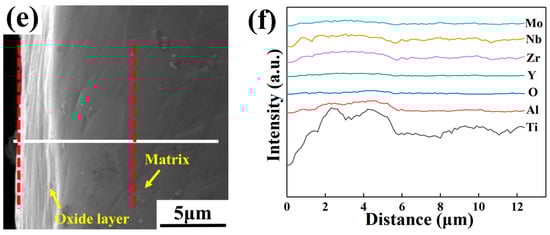 Figure 13, Figure 14 and Figure 15 show the cross-section morphologies and elemental distribution curves of the oxidation surfaces of as-cast alloys with different Y content for different temperatures under oxidation for 120 h. It can be seen that the oxidation profile can be divided into the surface oxide film, oxide layer and matrix. The surface oxide film is difficult to distinguish due to its extremely thin thickness. The thickness of the oxide layer of the alloys with different Y content oxidized at different temperatures for 120 h is illustrated in Table 9. It can be seen that under the same oxidation temperature conditions, the 0.1 wt.% Y composition alloy has the smallest oxide layer thickness, further proving that it has the best oxidation resistance. According to the elemental distribution line scan and thermodynamic calculations analysis, it can be seen that Al2O3 is mainly distributed in the outermost layer of the oxide film, the inner layer of the oxide film is mainly composed of TiO2 and a small amount of Al2O3, and the oxide layer is mainly TiO2. This shows that in the early stage of oxidation, Ti and Al elements diffuse outward and oxidation reaction occurs; the generated oxides cover Y2O3 to form an oxide film with a loose structure. With the extension of oxidation time, oxygen atoms can diffuse inward through the gaps and cracks in the oxide film and oxidize with Ti atoms inside the matrix to form an oxygen-rich layer. Due to the different types of oxidation products in the oxide surface and oxide layer, the stress concentration generated means that the oxide film and the oxide layer cannot be tightly bonded, resulting in the oxide layer being peeled off at more than 750 °C.