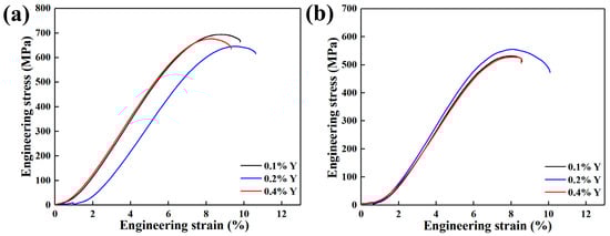 High-temperature tensile stress–strain curves of as-cast alloys with different Y content under different test temperatures: (a) 700 °C; (b) 750 °C.