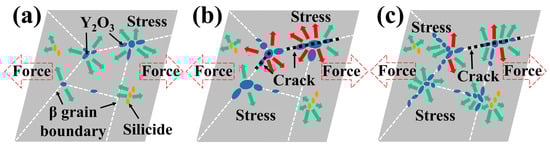 In addition, the silicide in the microstructure will change the stress at the interface of α/β laths [,], and it synergistically affects the fracture strength and toughness of the alloy with the Y2O3 phase. Therefore, the mechanical properties of the alloys are affected by the distribution of the Y2O3 phase, silicide and temperature factors. A schematic illustration of the fracture mechanism of the alloys with different Y content is shown in Figure 19.