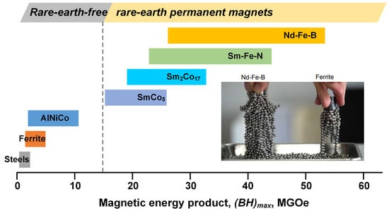 Over the past century, there has been significant development in permanent magnetic materials, resulting in a steady increase in their magnetic energy product (BH)max from rare-earth-free permanent magnetic materials ((BH)max < 15 MGOe) to rare-earth permanent magnetic materials ((BH)max ≈ 15–55 MGOe) (Figure 1) [,,,]. Currently, the Nd-Fe-B based rare-earth permanent magnetic material possesses the highest (BH)max and has been widely applied in numerous industrial fields, such as new energy vehicles and wind power generation [,,,,,]. Among permanent magnetic materials, sintered Nd-Fe-B magnets are highly popular on account of their mature manufacturing technology and excellent magnetic performance, capturing over 50% of the market []. However, the high-coercivity sintered magnets depend heavily on the expensive heavy rare-earth elements (HREs) such as dysprosium (Dy) and terbium (Tb) for the application of traction motors working at temperatures above 150 °C [,,,]. The HREs are used for the substitution of Nd to heighten the anisotropy field (HA) of the main phase because the HA values of Dy2Fe14B (μ0HA = 15.0 T) and Tb2Fe14B (μ0HA = 22.0 T) are much higher than those of Nd2Fe14B (μ0HA = 7.6 T). The scarcity of HRE resources has posed a challenge to their sustainability since the “Rare-earth crisis” occurred around 2011. Therefore, numerous researchers are making efforts to develop low-HRE or even HRE-free Nd-Fe-B magnets accompanied with high coercivity [,,]. The application of the grain boundary diffusion process (GBDP) has proven effective in decreasing the usage of HREs in the sintered Nd-Fe-B magnets through the formation of HRE-enriched shells surrounding grains [,,]. Additionally, controlling the microstructure by reducing grain sizes offers another efficient approach to raise coercivity [,,,,].