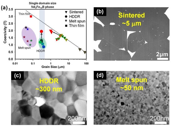 (a) The statistical relationship between coercivity and grain size for sintered Nd-Fe-B magnets, HDDR Nd-Fe-B powders and melt-spun Nd-Fe-B ribbons. Typical microstructural features of (b) sintered Nd-Fe-B magnets, (c) HDDR Nd-Fe-B powders and (d) melt-spun Nd-Fe-B ribbons. Reproduced with permission []. Copyright 2012, Elsevier.