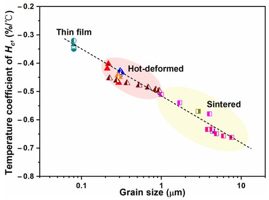 Temperature coefficient of coercivity (25–180 °C) vs. grain size for various types of HRE-free Nd-Fe-B magnets. Reproduced with permission []. Copyright 2020, Elsevier.