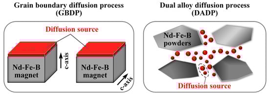 - Loewe, K.; Brombacher, C.; Katter, M.; Gutfleisch, O. Temperature-dependent Dy diffusion processes in Nd-Fe-B permanent magnets. Acta Mater. 2015, 83, 248–255. [Google Scholar] [CrossRef]