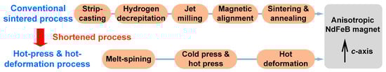 The crystal alignment mechanism employed in the production of HD magnets completely differs from the traditional sintered magnets. In sintered magnets, the crystallographic alignment is achieved via magnetic alignment, while in HD magnets, such alignment is achieved through plastic deformation at high temperatures []. Figure 5 shows a comparison between the conventional sintered process and the hot-press and hot-deformation process, which both can produce the anisotropic Nd-Fe-B magnets [,]. It is clear that the production process of HD magnets is simpler than that of sintered magnets, showing less processing steps to prepare the anisotropic Nd-Fe-B magnets.