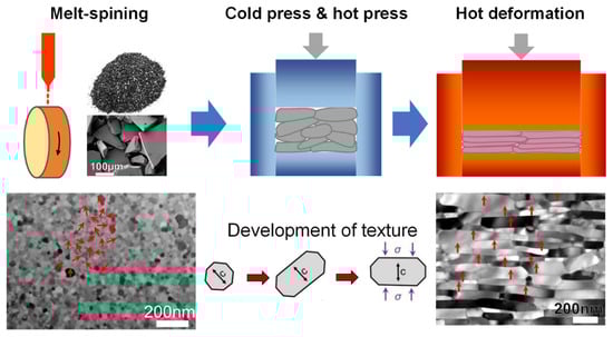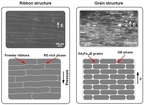 Production process of HD magnets and their microstructural features at different stages. The c-axis alignment of grains is indicated by red arrows. Reproduced with permission []. Copyright 2018, Elsevier.