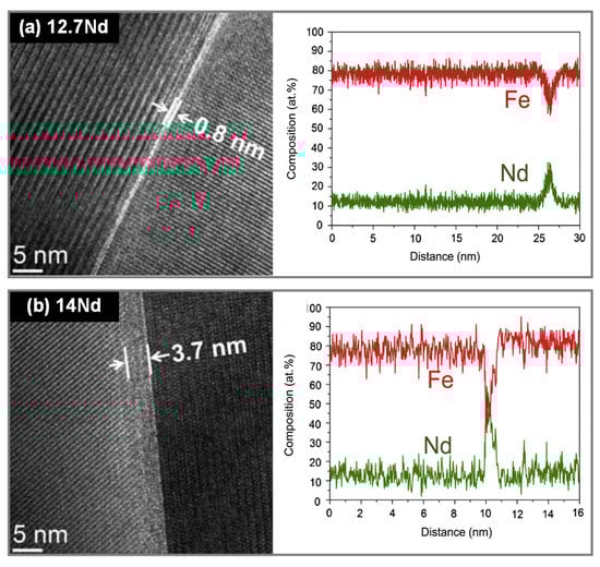 The presence of intergranular RE-rich phases is crucial for achieving high coercivity in the HD magnets [,]. According to Liu et al. [], the overall Nd content within the magnets has a great impact on both the thickness and RE content of the grain boundary. Specifically, at an overall Nd content of 12.7 at.%, the grain boundary thickness is approximately 0.8 nm, and the Nd proportion of the grain boundary is roughly 23 at.%, which is believed to be ferromagnetic (Figure 9a). By contrast, at an overall Nd content of 14.0 at.%, the grain boundary thickness increases to approximately 3.7 nm and the Nd proportion of the grain boundary rises to about 46 at.%, which is thought to be nonferromagnetic (Figure 9b). These different features of the grain boundary led to a coercivity of 0.9 T for the 12.7 Nd magnet and 1.8 T for the 14.0 Nd magnet. These results indicate that the thicker and nonferromagnetic grain boundary phase can decouple the hard magnetic grains and enhance the coercivity of magnets.