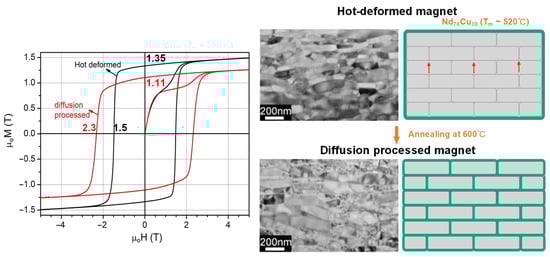 - Sawatzki, S.; Kübel, C.; Ener, S.; Gutfleisch, O. Grain boundary diffusion in nanocrystalline Nd-Fe-B permanent magnets with low-melting eutectics. Acta Mater. 2016, 115, 354–363. [Google Scholar] [CrossRef]