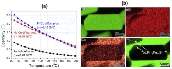 (a) Temperature dependence of coercivities for the as-deformed, Nd-Cu infiltrated and Pr-Cu infiltrated magnets, respectively. (b) Elemental distribution of Fe, Nd, Co and Pr for the Pr-Cu infiltrated magnet. Reproduced with permission []. Copyright 2015, Elsevier.
