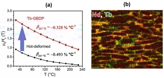 (a) Temperature dependence of coercivities for the as-deformed magnet and Nd60Tb20Cu20 infiltrated magnet. (b) Typical elemental mapping of Nd and Tb for the Nd60Tb20Cu20 infiltrated magnet. Reproduced with permission []. Copyright 2018, Elsevier.