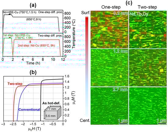 (a) Schematic process flows of the one-step diffusion process and two-step diffusion process. (b) Typical demagnetization curves of the as-deformed magnets and the diffusion-processed magnets suffered by the conventional diffusion process and the two-step diffusion process. (c) Elemental mappings of Nd, Tb and Dy obtained at different depths from the magnet surface of the diffusion-processed magnets suffered by the one-step diffusion process and the two-step diffusion process. Reproduced with permission []. Copyright 2021, Elsevier.