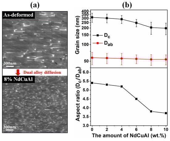 Apart from HRE-containing alloys, HRE-free low-melting-point eutectic alloys such as Nd-M and Pr-M (M = Cu, Al, Ga, etc.) were also attempted to enhance the coercivity using the DADP. However, the doping of Nd-M alloy powders, such as Nd-Cu, Nd-Cu-Al and Nd-Fe-Ga-Cu, showed unremarkable results in the increase in coercivity (<2.1 T) [,,,]. Notably, the doping of Pr-M alloy powders, such as Pr70Cu30 and Pr90Ga10, obtained considerable coercivity levels above 2.3 T [,]. It is worth mentioning that the grain size and the grain aspect ratio simultaneously decrease with the increase in alloy content (Figure 16) []. Therefore, for the DADP without the use of HREs, not only the nonferromagnetic grain boundary phase but also the decreased grain size and grain aspect ratio are responsible for the enhancement of coercivity.