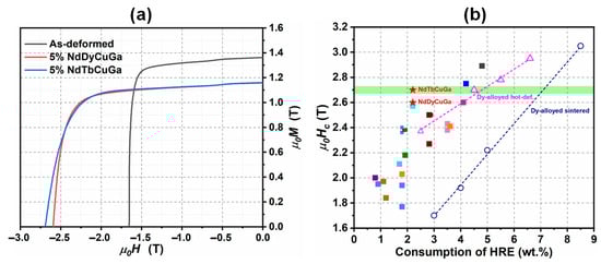 In addition, multicomponent HRE-containing alloys with relatively low melting points were also used in order to improve the utilization efficiency of HREs in the HD magnets. It was reported by Lee et al. [] that the addition of a Nd35Dy35Cu30 alloy with a low melting point of 610 °C achieved an almost identical coercivity compared to the doping with a Dy70Cu30 alloy with high melting point of 795 °C, almost doubling the utilization efficiency of the HREs. Recently, Xia et al. [] also reported that the high coercivity levels of 2.6 T and 2.7 T were obtained in 6 mm thick bulk HD magnets through the addition of Nd35Dy35Cu15Ga15 and Nd35Tb35Cu15Ga15 alloys with low melting points of 616 °C and 605 °C, respectively, consuming only 2.2 wt.% HREs (Figure 17a). These results are comparable with previous studies that used almost twice the amount of HREs (~4.5 wt.%) (Figure 17b).
