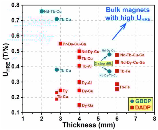 where ∆Hc is the coercivity increment and wt.% of HREs is the mass fraction of HREs consumed in the magnets. Figure 18 provides a comparison between the UHRE and the thickness for the HD magnets produced by various preparation processes and diffused by various HRE-containing alloys. It is evident that the traditional GBDP has high UHRE values for the thin magnets with thicknesses <3 mm, while it shows unsatisfactory outcomes for the thicker magnets. Thus, the two-step diffusion process with an increased process cost is developed for a high UHRE in the thick magnets. The DADP is less effective in achieving high UHRE values for thin magnets (<3 mm) compared to the GBDP, but it can easily realize decent UHRE values in the thick magnets (>3 mm). For the bulk HD magnets with a thickness of 6 mm, the doping of Nd-Dy-Cu-Ga and Nd-Tb-Cu-Ga alloys surpassed that of previous works with regard to achieving a high UHRE.