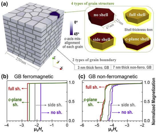 (a) Micromagnetic models of the HD Nd-Fe-B magnets with four configurations of grain structure. (b,c) Simulated demagnetization curves of the various models with different grain structures. The grain boundary phase is assumed to be ferromagnetic in (b) and nonferromagnetic in (c). Reproduced with permission []. Copyright 2018, Elsevier.