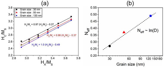 (a) Hc/Ms vs. HA/Ms of the models with various average grain sizes. The parameters of α and Neff are obtained by a linear fitting of Equation (3). (b) Neff values vs. grain size of the micromagnetic models. Reproduced with permission []. Copyright 2014, Elsevier.