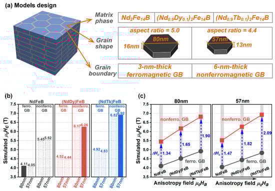 (a) Micromagnetic models designed by different structures. (b) Comparison of the simulated coercivity values of Nd-Fe-B models with different 2:14:1 phases, grain sizes and grain boundary phases. (c) Simulated coercivity value dependence on the HA of 2:14:1 phases for the models with various grain sizes and grain boundary phases. Reproduced with permission []. Copyright 2022, Elsevier.
