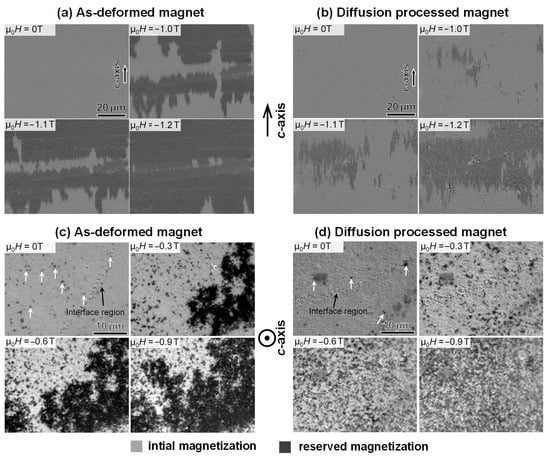 Understanding the evolution of magnetization reversal in HD Nd-Fe-B magnets before and after the GBDP is crucial for the strategy of coercivity enhancement. Figure 24a,b illustrate the magnetization reversal processes of the as-deformed and diffusion-processed magnets, respectively, with the c-axis in-plane, observed by magneto-optic Kerr effect (MOKE) microscopy []. For the as-deformed magnet, cascade propagation of domain walls was observed in the lateral direction perpendicular to the c-axis when the applied magnetic field reached −1.0 T. Conversely, for the diffusion-processed magnet, the propagation of reversed domains occurs along the lateral direction without the cascade propagation, and a higher external field is needed to drive the reversal of domains. The change processes of the magnetization reversal of the as-deformed and diffusion-processed magnets with the c-axis out-of-plane were also observed, as shown in Figure 24c,d. The cascade-like propagation of domain reversals that exists in the as-deformed magnet transforms into the magnetization reversals in the individual grains of the diffusion-processed magnet. The reason for this transition is the strengthening of the domain wall pinning force when intergranular phases shift from ferromagnetic to nonferromagnetic after the GBDP.