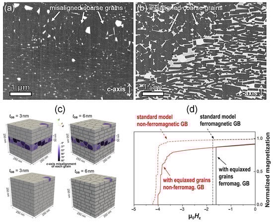 It is worth noting that the reversed magnetic domains originated near the interfaces of the melt-spun ribbons (Figure 24c), which are the weak regions in the microstructure of HD magnets leading to the low coercivity of magnets. Typically, the strongly misaligned equiaxed coarse grains (CGs) are distributed at the ribbon interfaces, as shown in Figure 25a,b. To investigate the effect of equiaxed CGs on coercivity, micromagnetic simulations were performed. Figure 25c illustrates four models of HD Nd-Fe-B magnets with and without misaligned CGs for a thin (3 nm) ferromagnetic grain boundary phase and a thick (6 nm) nonferromagnetic grain boundary phase, and Figure 25d shows their simulated demagnetization curves. For the exchange-coupled models with a thin ferromagnetic grain boundary phase, a relatively low coercivity of 1.62 T was obtained in this model including isotropic equiaxed CGs. However, by simply removing these CGs, a higher coercivity of 1.75 T was achieved. For the exchange-decoupled models with a thick nonferromagnetic grain boundary phase, the model with isotropic equiaxed CGs had a coercivity 4.0 T. The highest coercivity of 4.2 T was achieved when the model was free of isotropic equiaxed CGs. It should be noted that the inclusion of isotropic equiaxed grains substantially reduces the remanence of the samples.