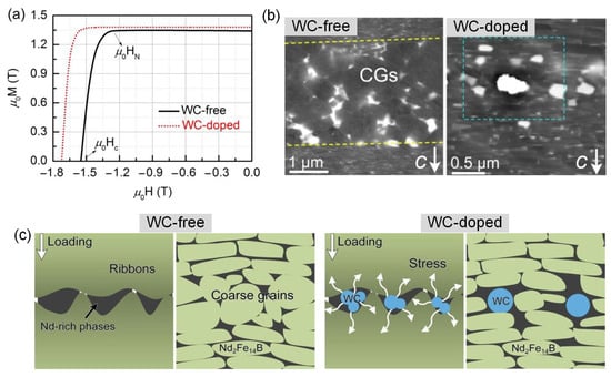 (a) Demagnetization curves of WC-free and WC-doped HD magnets. (b) CG region between the powder ribbons in the WC-free and WC-doped HD magnets. The CG region is marked by dotted lines. The c-axis is in-plane. (c) Schematic diagrams of the local stress reinforcement influenced by WC. Reproduced with permission []. Copyright 2019, Elsevier.